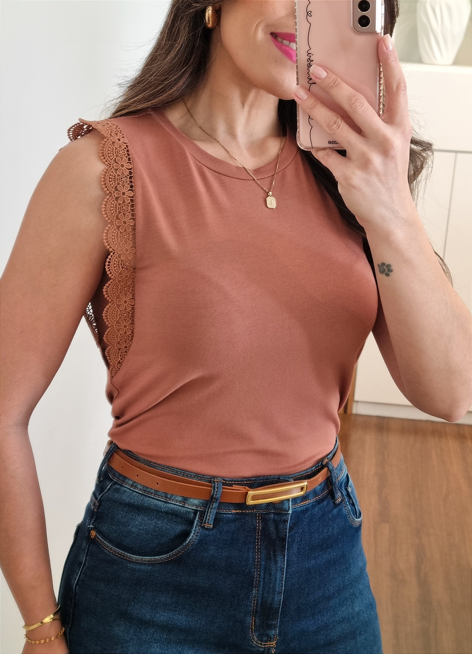 Blusa confeccionada em malha de viscose, com decote redondo, comprimento tradicional e detalhe de renda guipir na cava (frente e costas).
