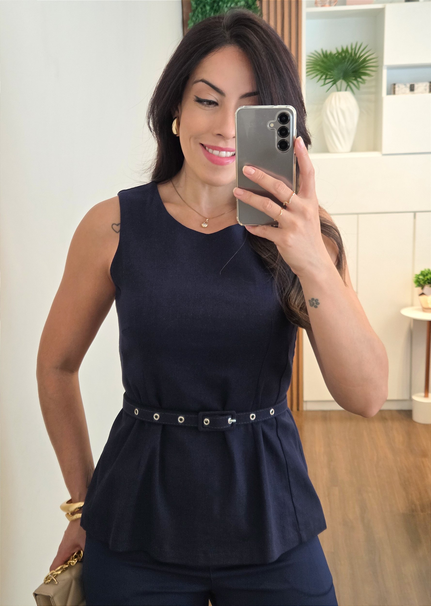 Blusa Peplum com Linho e Cinto Marinho