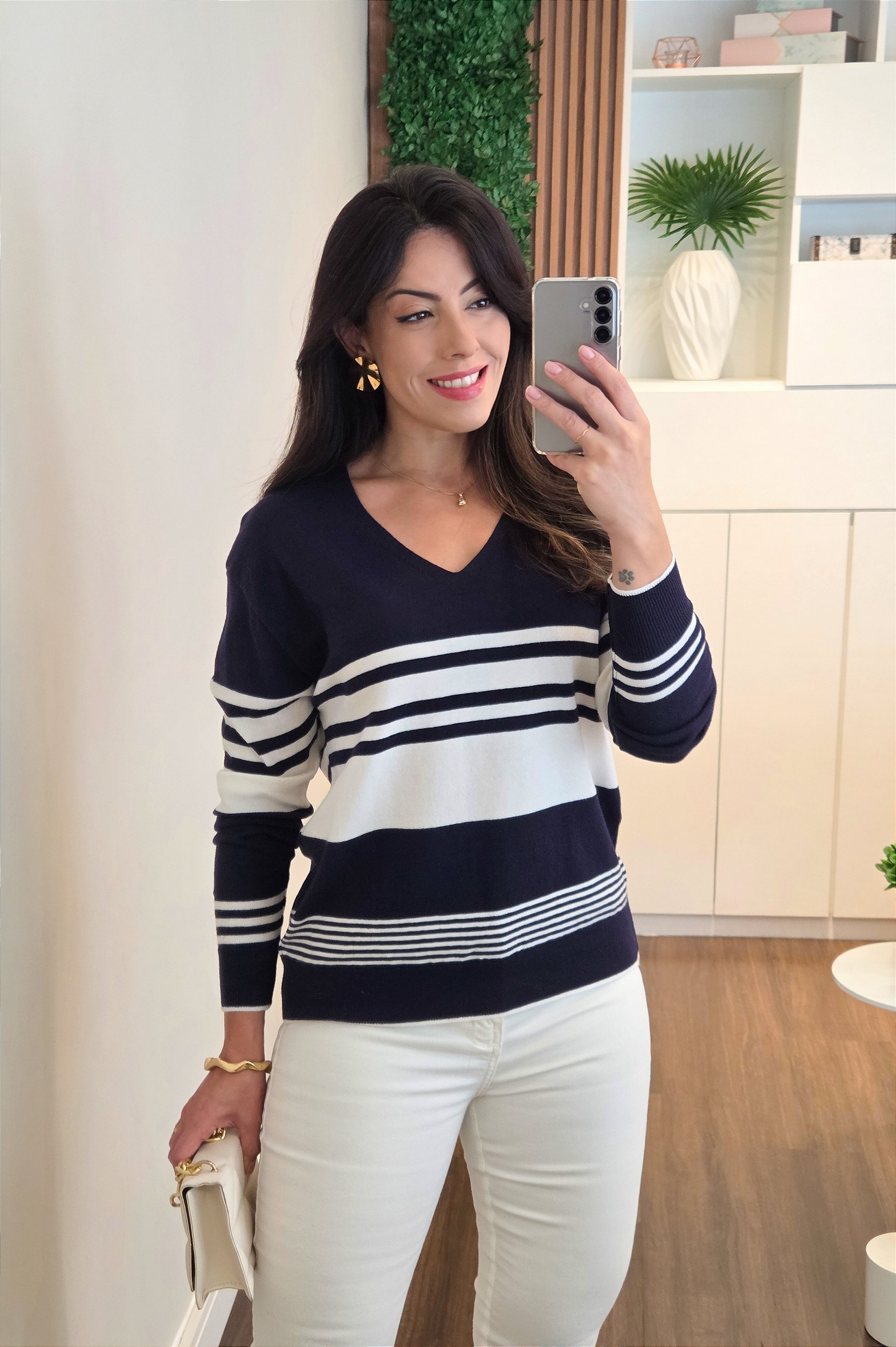 Feita em tricô com toque suave e caimento perfeito, a blusa possui manga longa e listras em tons marinho e branco, destacando-se como peça versátil para compor looks casuais e elegantes na meia estação. É uma ótima escolha para ambientes que pedem conforto com estilo, podendo ser usada com calças claras ou jeans para um visual equilibrado.