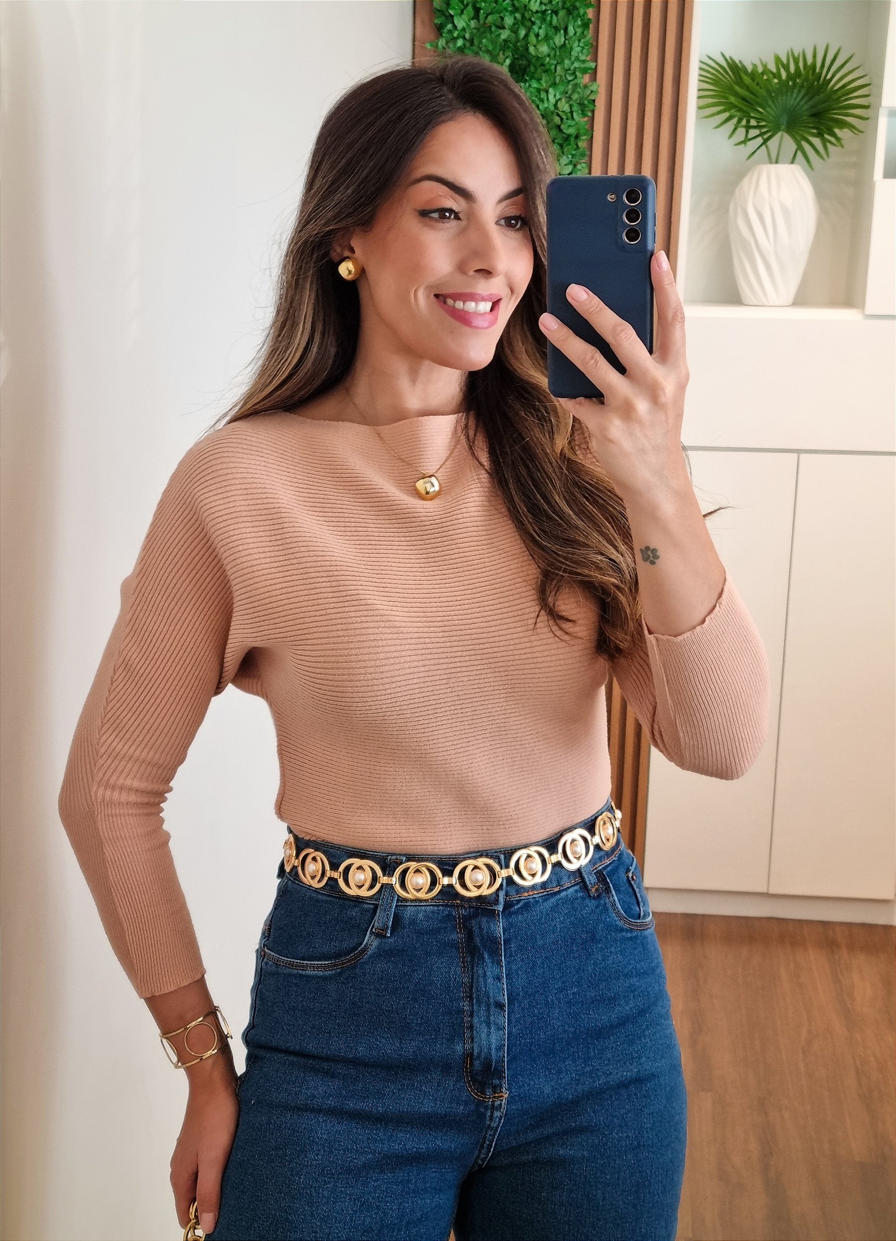 Blusa em tricô canelado, confeccionada em fio bem macio e com elasticidade, modelagem ajustada ao corpo, decote canoa, manga longa estilo morcego e comprimento tradicional.