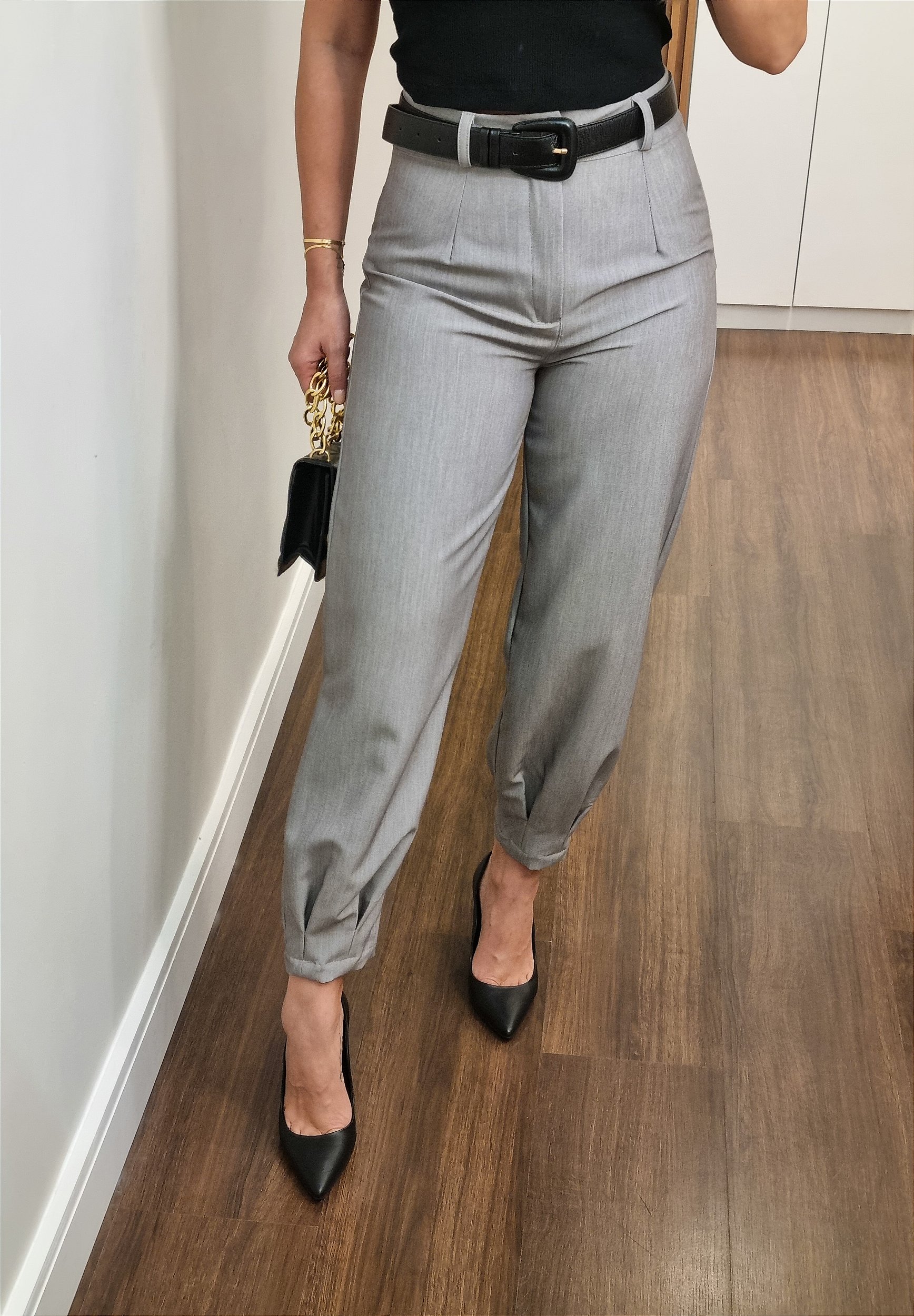 Calça confeccionada em poliviscose, tecido leve e de toque macio, com modelagem cenoura, mais ajustada no quadril, larga nas pernas e ajustada na barra, com cintura alta, passante para cinto, pregas na cintura e na barra, fechamento em botão forrado e zíper.