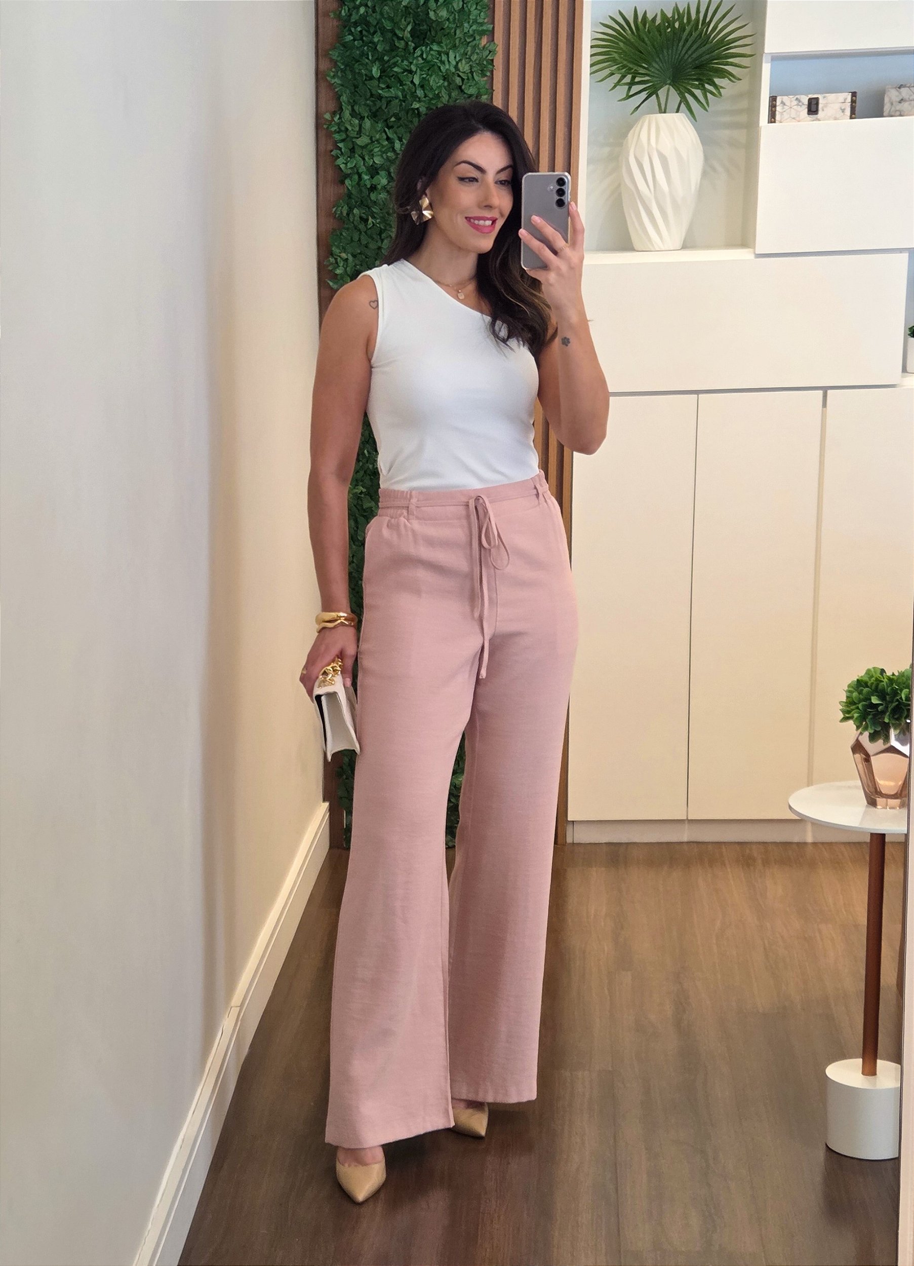Calça confeccionada em viscose sarjada , tecido leve, texturizado e fluído, modelagem reta, bolso faca frente, cintura alta com elástico e frente lisa, acompanha faixa para amarração ajustável.