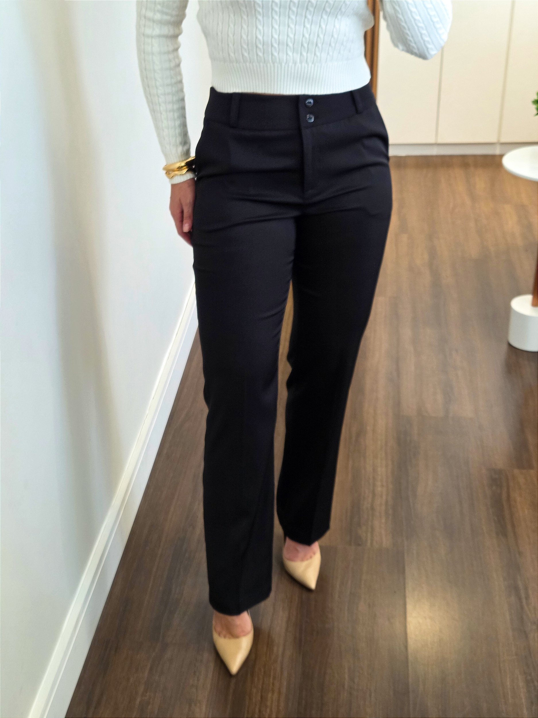 Essa calça é feita em crepe, um tecido que oferece conforto e pouca elasticidade, garantindo um caimento alinhado e elegante para o dia a dia.