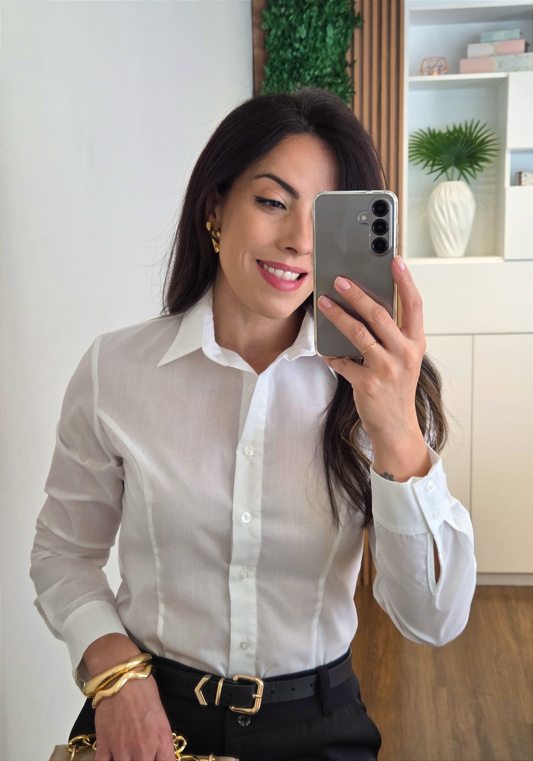 Essa camisa é feita em uma mistura de poliéster e algodão, com composição que confere textura resistente sem elasticidade, com uma leve transparência (ideal para utlizar com lingerie nude). O design conta com mangas longas ajustadas por dois botões no punho, proporcionando ajuste firme e visual clássico. O modelo é levemente acinturado e possui recortes estratégicos que ajudam no caimento, trazendo conforto e elegância.