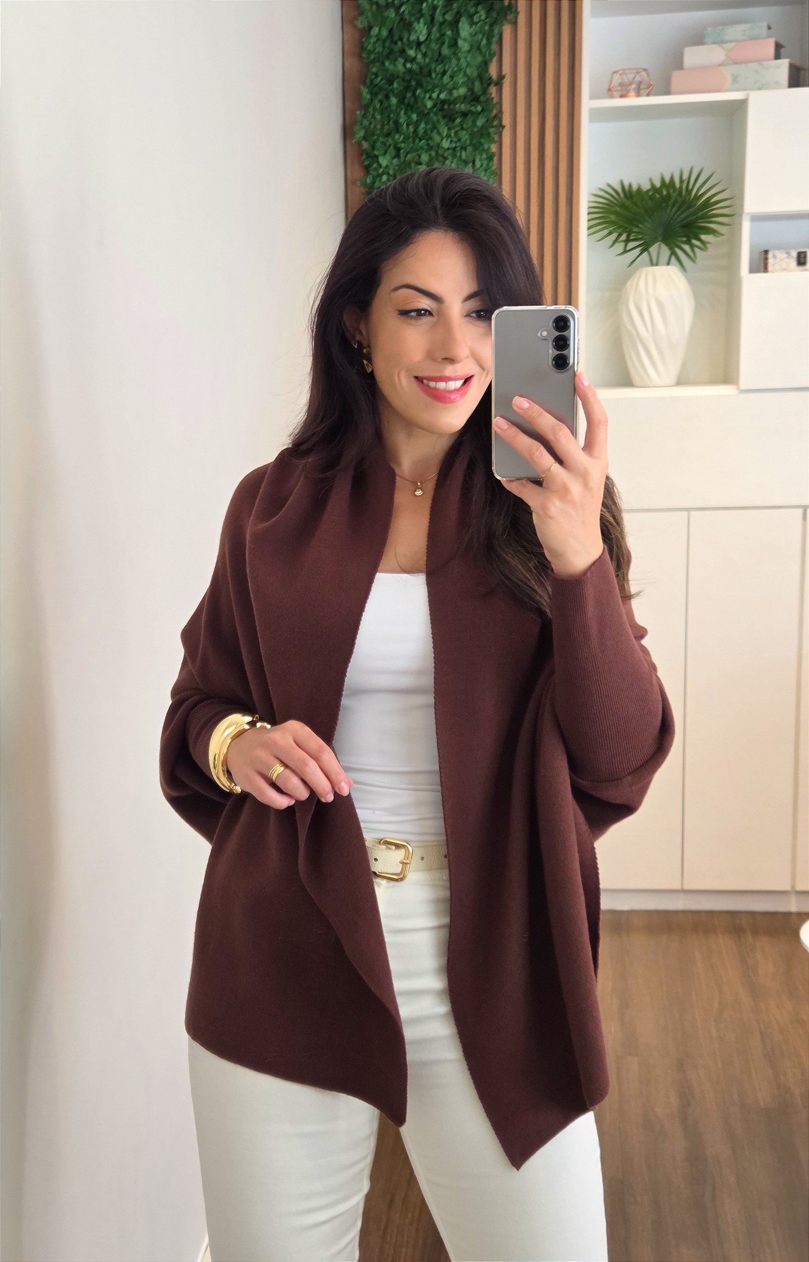 A capa é feita com um tricô macio, garantindo toque agradável e durabilidade. A manga possui acabamento canelado, que ajuda a ajustar a peça no corpo sem perder o estilo. A cor caramelo traz um tom quente e versátil para o guarda-roupa.