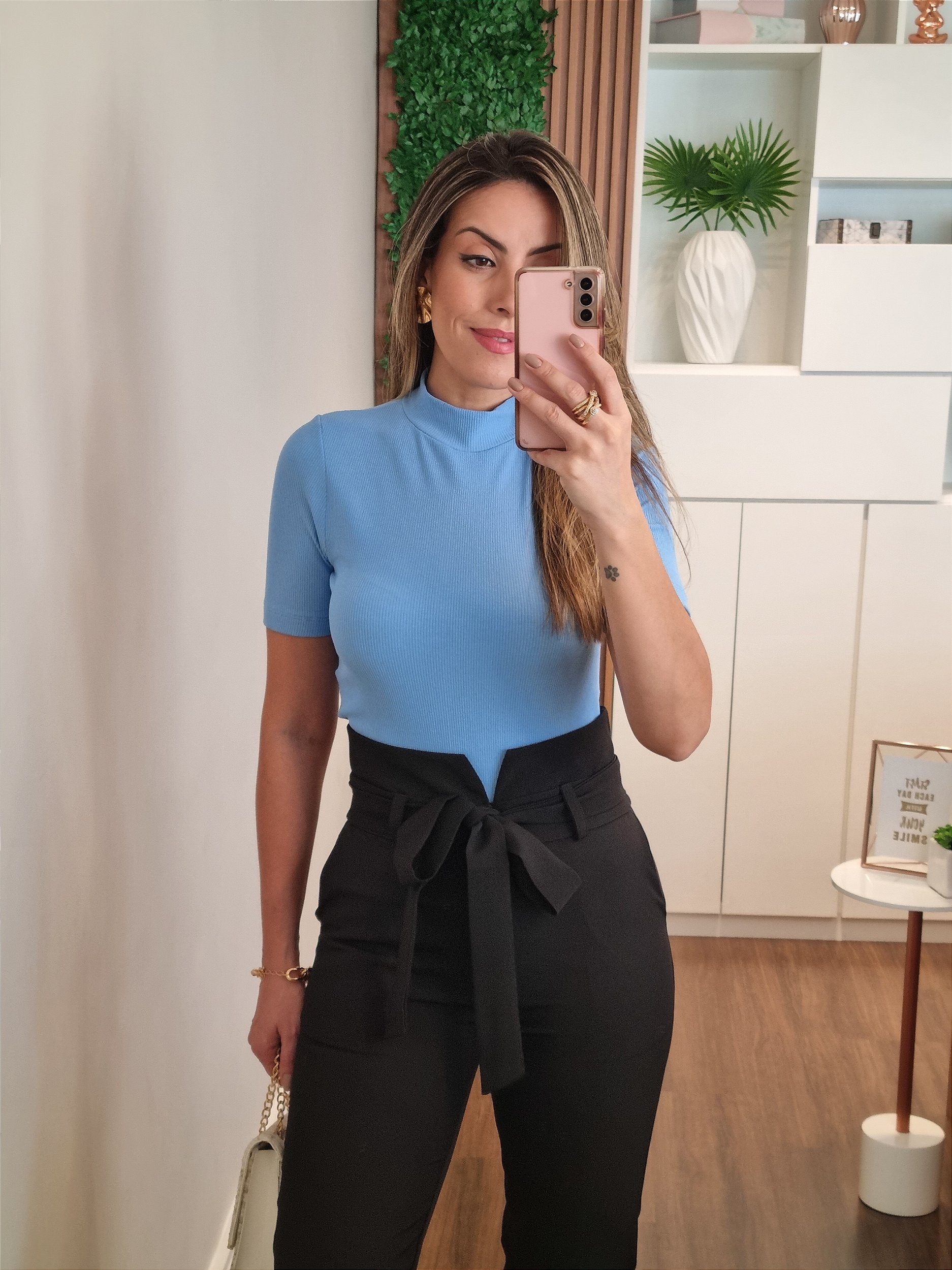 Cropped confeccionado em malha canelada de viscose com bastante elastano, gola alta, manga curta, modelagem justa ao corpo.