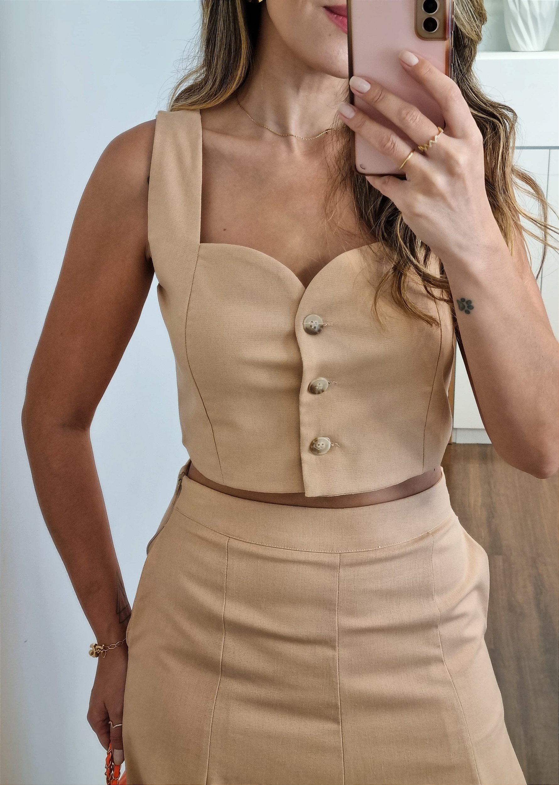 Cropped confeccionado em viscose com poliéster, linho, algodão e elastano, composto em alça larga, com decote princesa e fechamento em botões na frente.