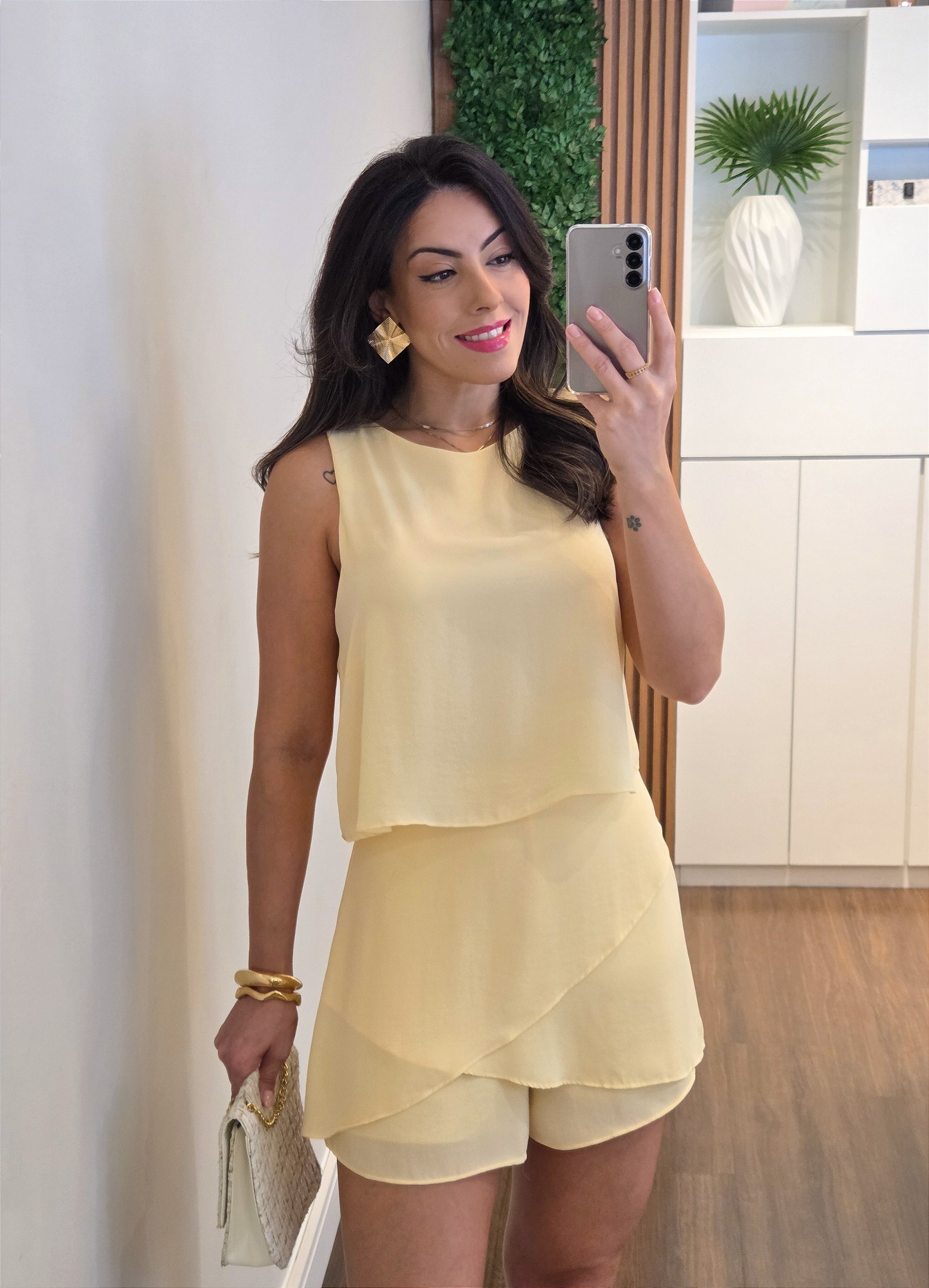 Macaquinho confeccionado em crepe, todo forrado, modelagem fluída em camadas, com decote redondo, alças largas, acinturado, decote aberto nas costas com botões e fechamento em zíper no shorts.