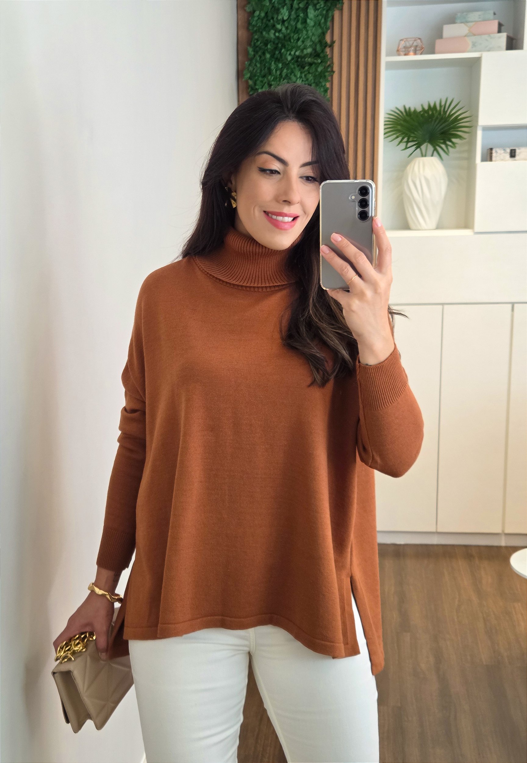 Este poncho é feito em tricô com elasticidade, conferindo conforto térmico e liberdade nos movimentos. A gola alta tipo cacharrel aquece sem apertar, enquanto a barra mullet cria um visual moderno que diferencia a peça. Ideal para quem busca uma peça versátil e elegante para dias frios.