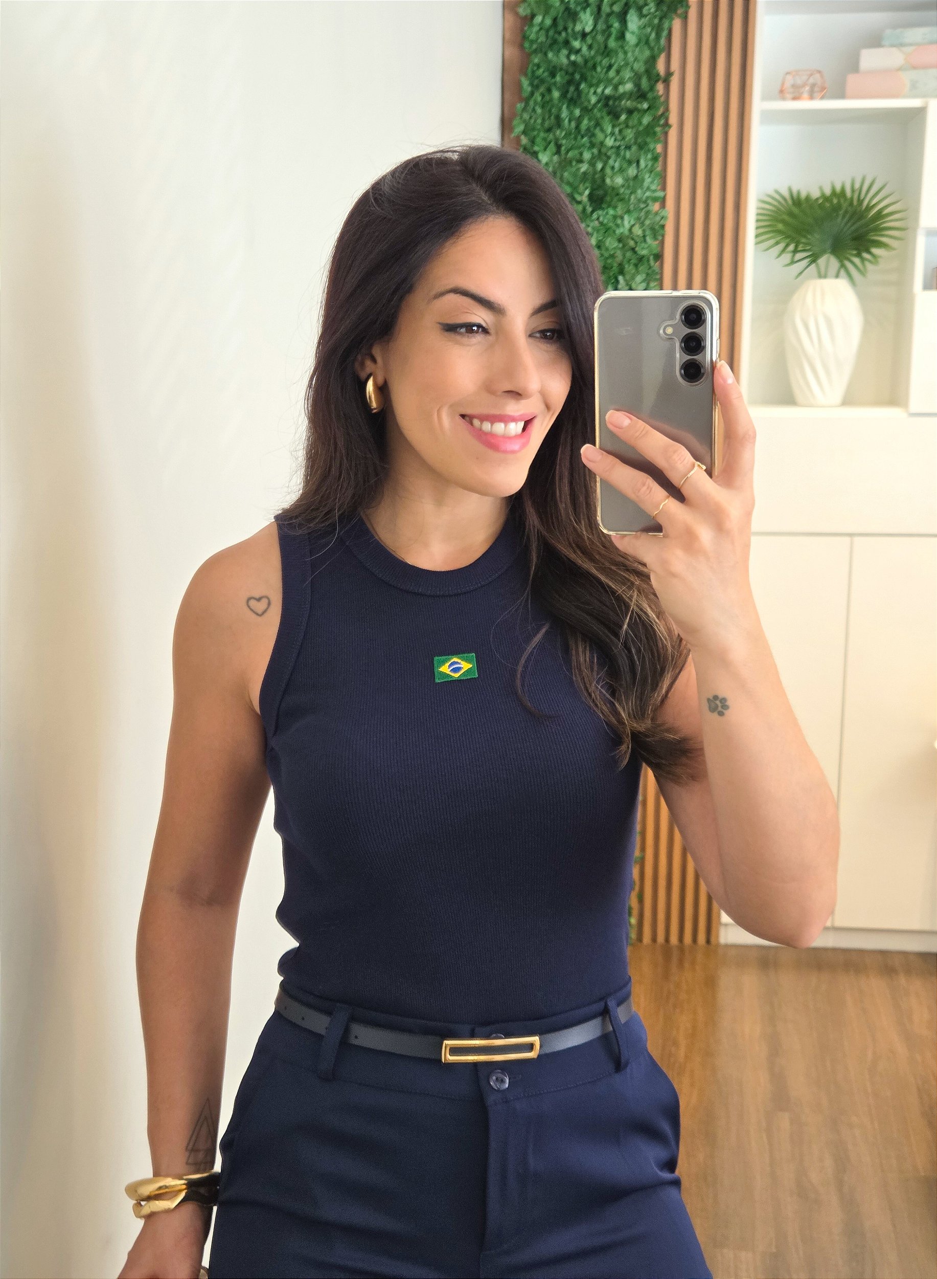 Regata feminina confeccionada em malha canelada de algodão com elastano, tecido encorpado, confortável e com boa elasticidade. Possui decote redondo clássico e destaque para o bordado da bandeira do Brasil, oferecendo um visual único e cheio de estilo.