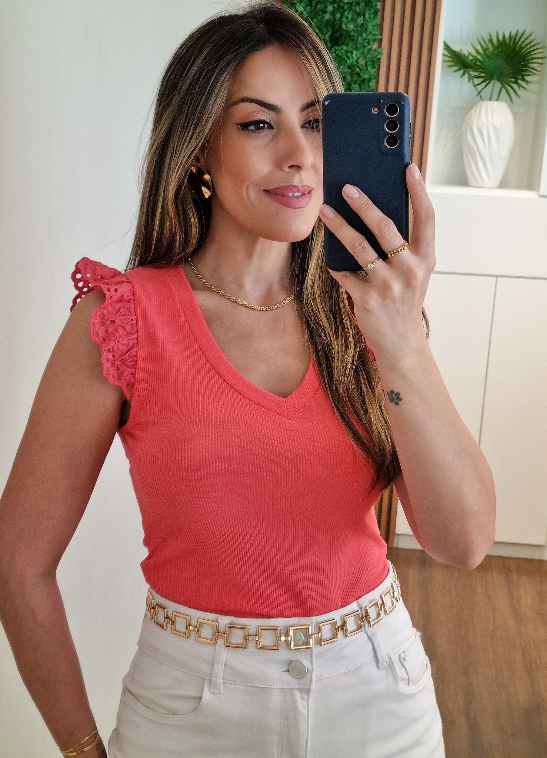 Regata confeccionada em malha canelada de viscose com elastano, modelagem ajustada ao corpo, decote V, costas fechadas e alça larga com detalhe de babado de laise na cava.