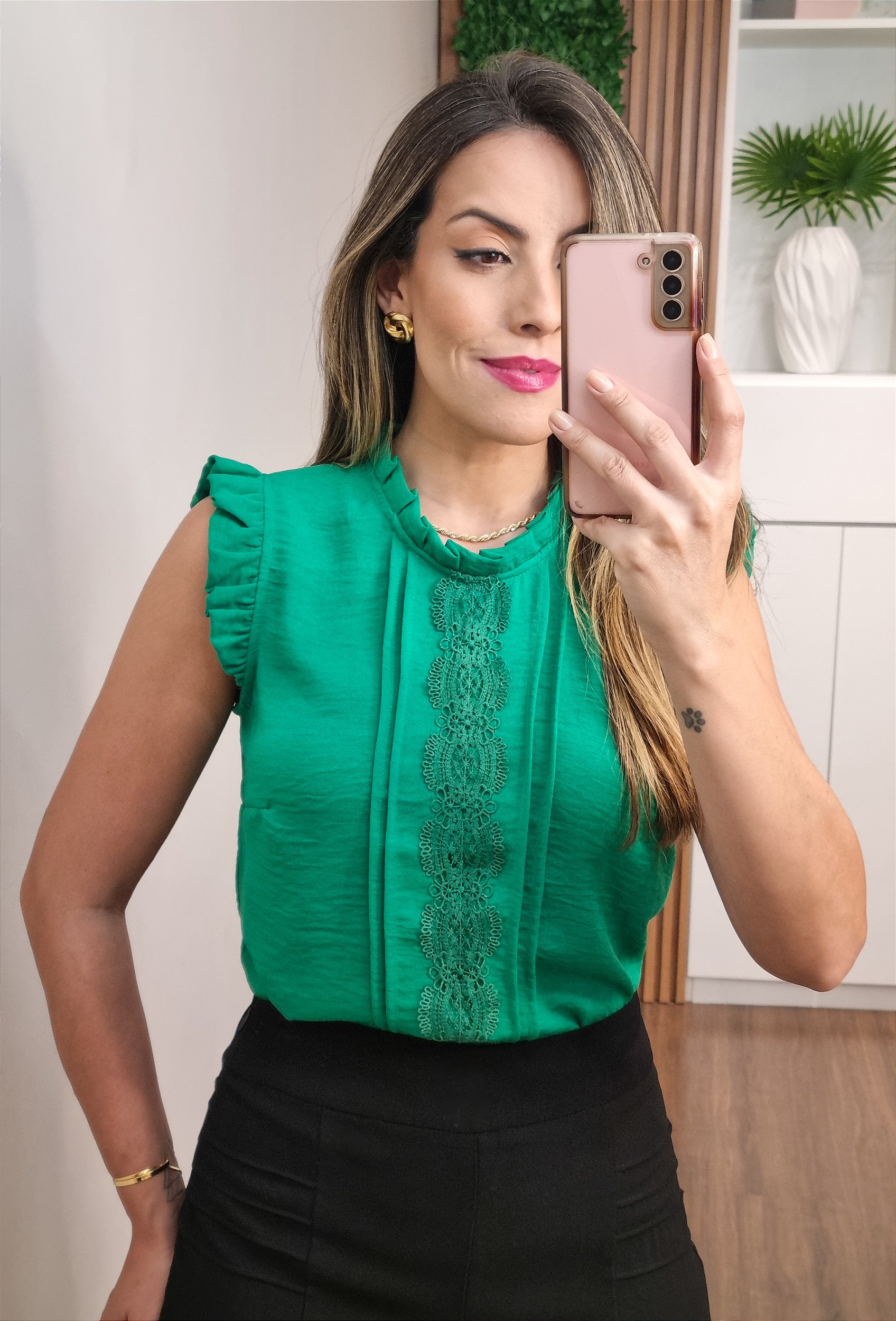 Regata confeccionada em crepe texturizado, com detalhe de renda guipir e dobradura na frente, gola redonda, babado na gola e na cava, fechamento em botão gola costas.