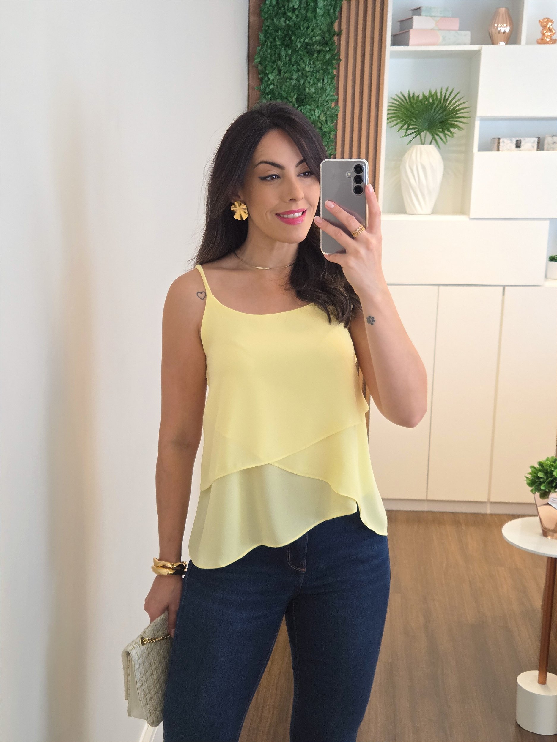 Regata confeccionada em crepe, tecido leve e fluído, com modelagem soltinha no corpo, trabalho frontal de camadas assimétricas, elástico costas, alça fina regulável e decote levemente arredondado.
