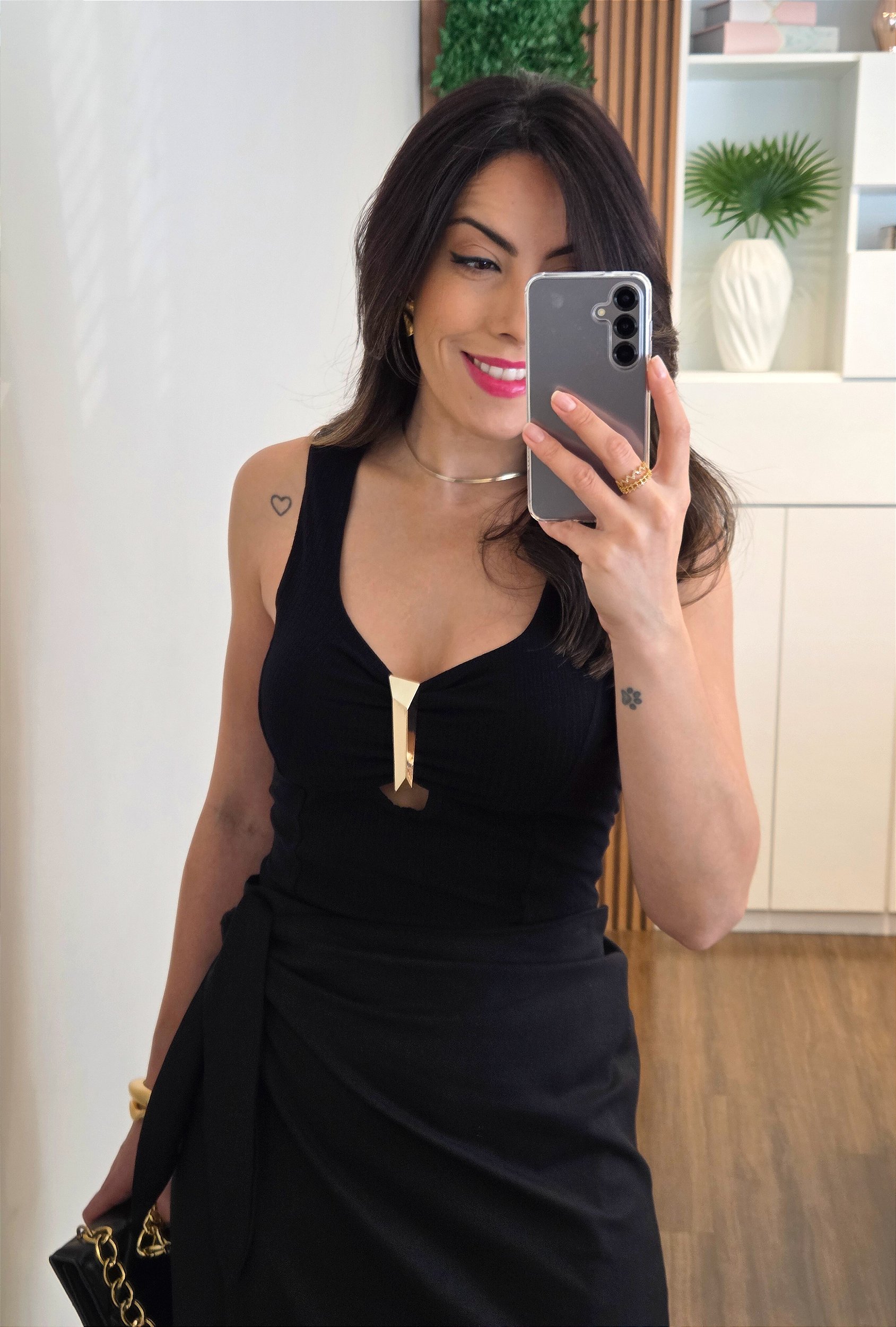 Regata confeccionada em ribana, tecido encorpado, canelado e com elasticidade, com recortes para caimento, alça larga, tecido duplo no busto, costas fechadas e detalhe de franzido com fivela dourada e recorte no busto, modelagem ajustada ao corpo com comprimento tradicional.