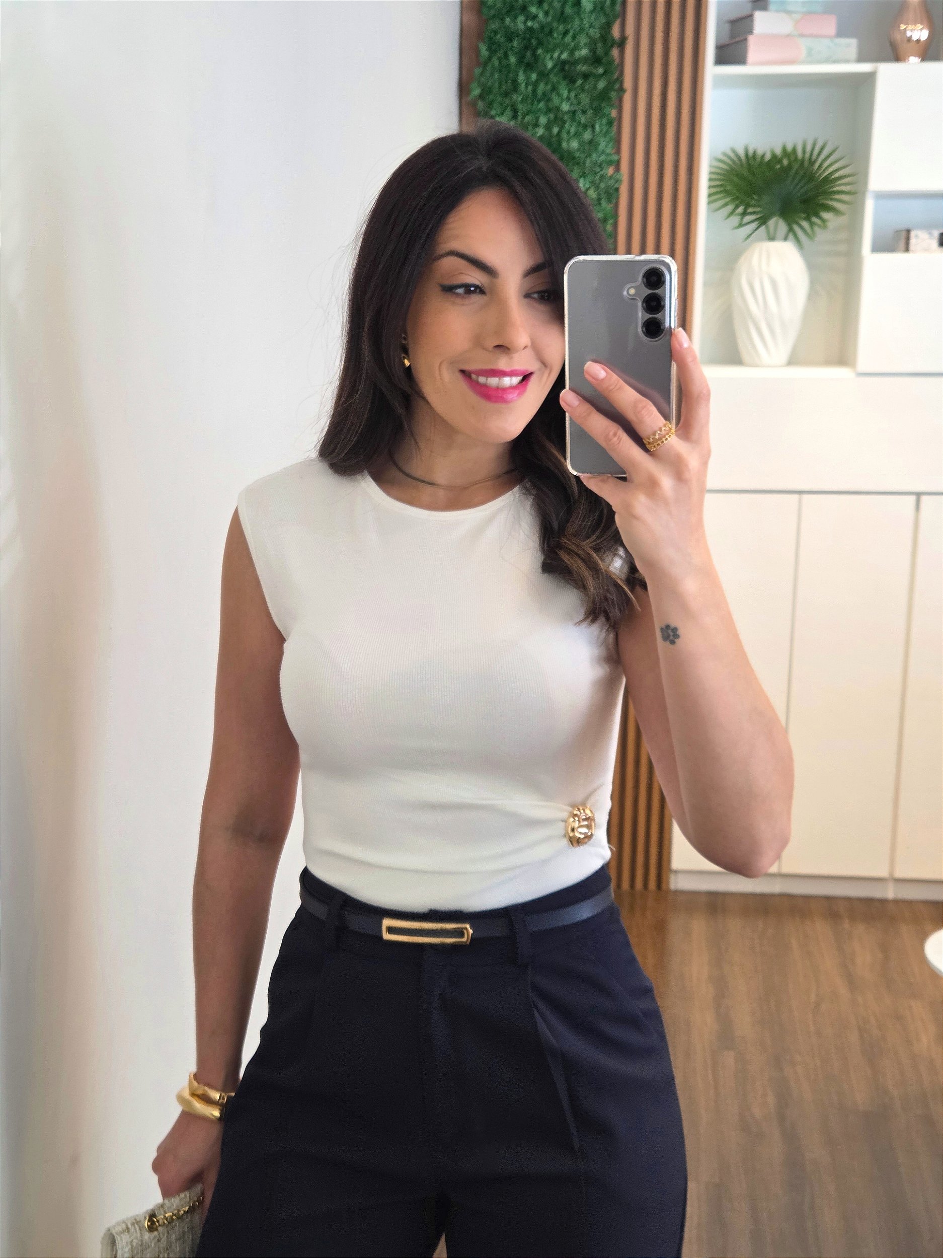 Regata confeccionada em ribana, tecido encorpado, canelado e com elasticidade, modelagem ajustada ao corpo, sem mangas, costas fechadas, decote redondo e detalhe de fivela orgânica dourada na lateral.