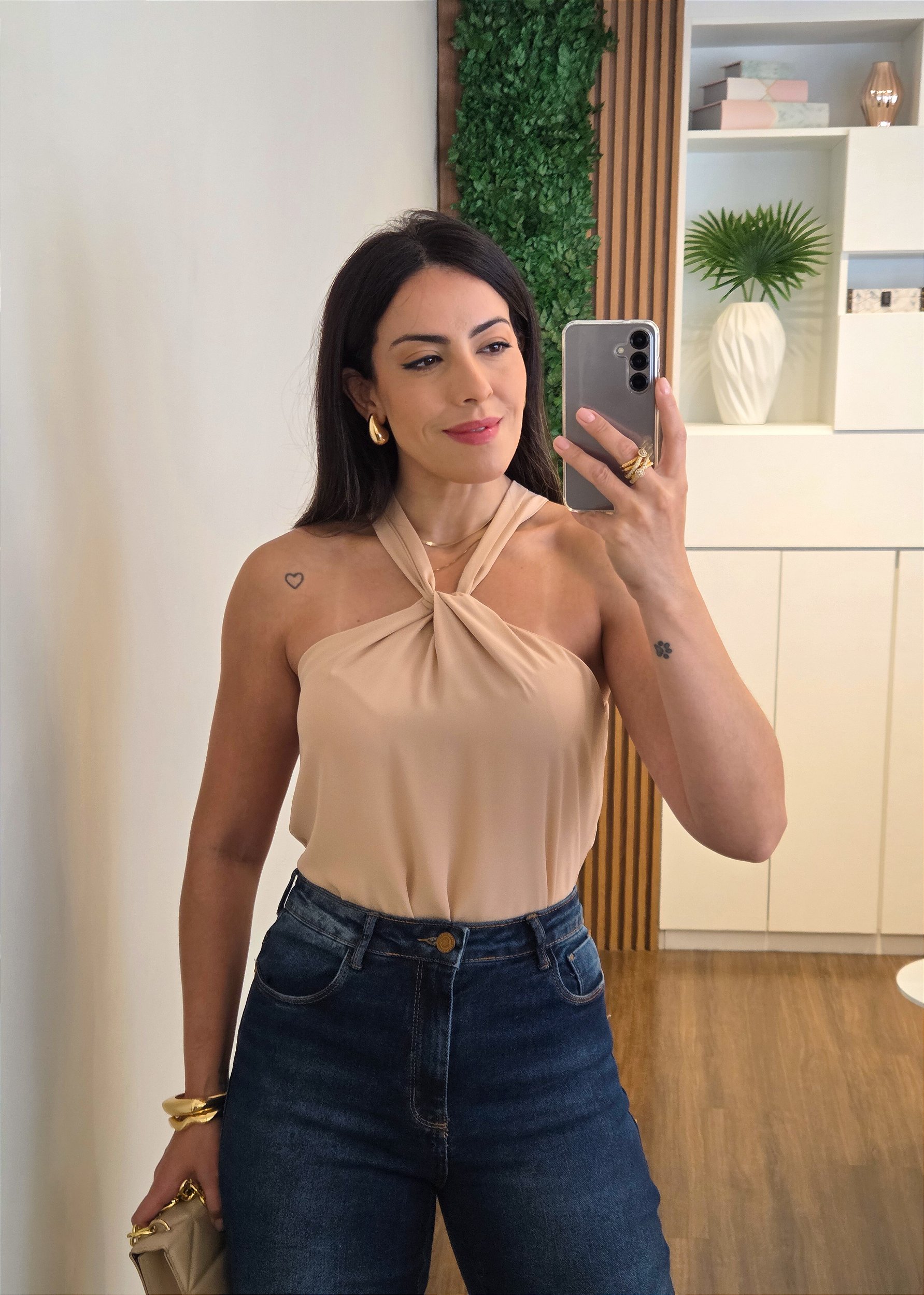 Regata confeccionada em crepe, com tecido duplo na frente, modelagem frente única com detalhe torcido no decote e comprimento tradicional.