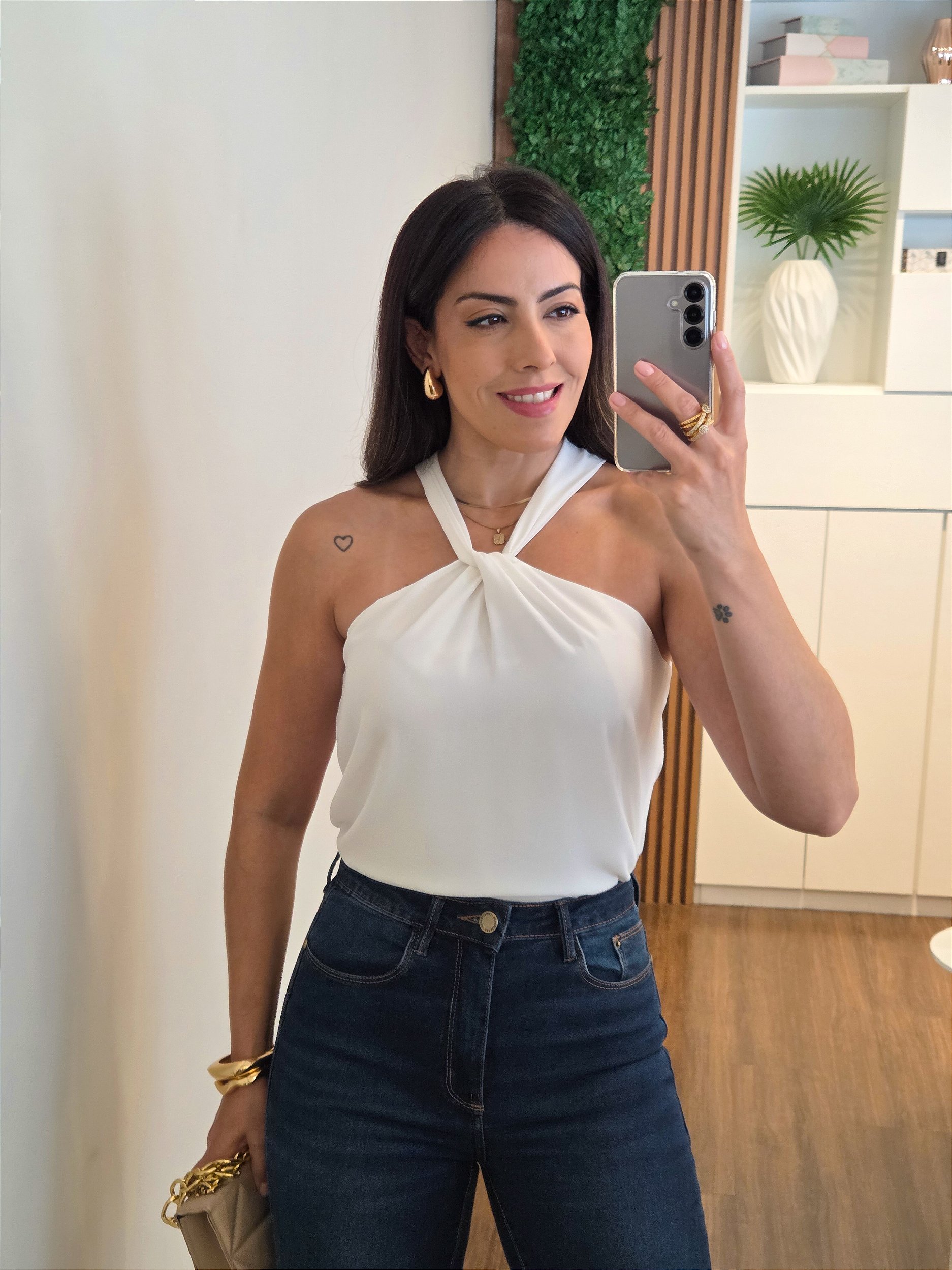Regata confeccionada em crepe, com tecido duplo na frente, modelagem frente única com detalhe torcido no decote e comprimento tradicional.