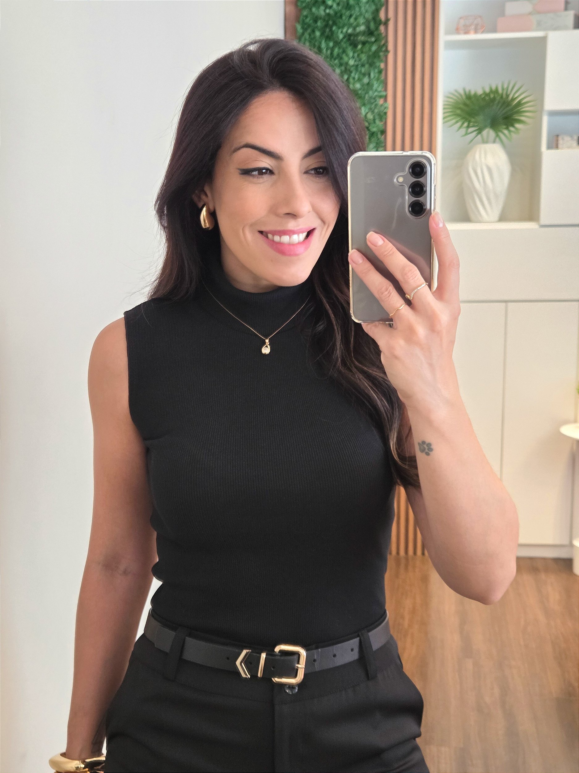 Regata canelada confeccionada em algodão com elastano, tecido encorpado, com textura canelada, modelagem ajustada e gola alta, modelo que traz conforto e estilo.