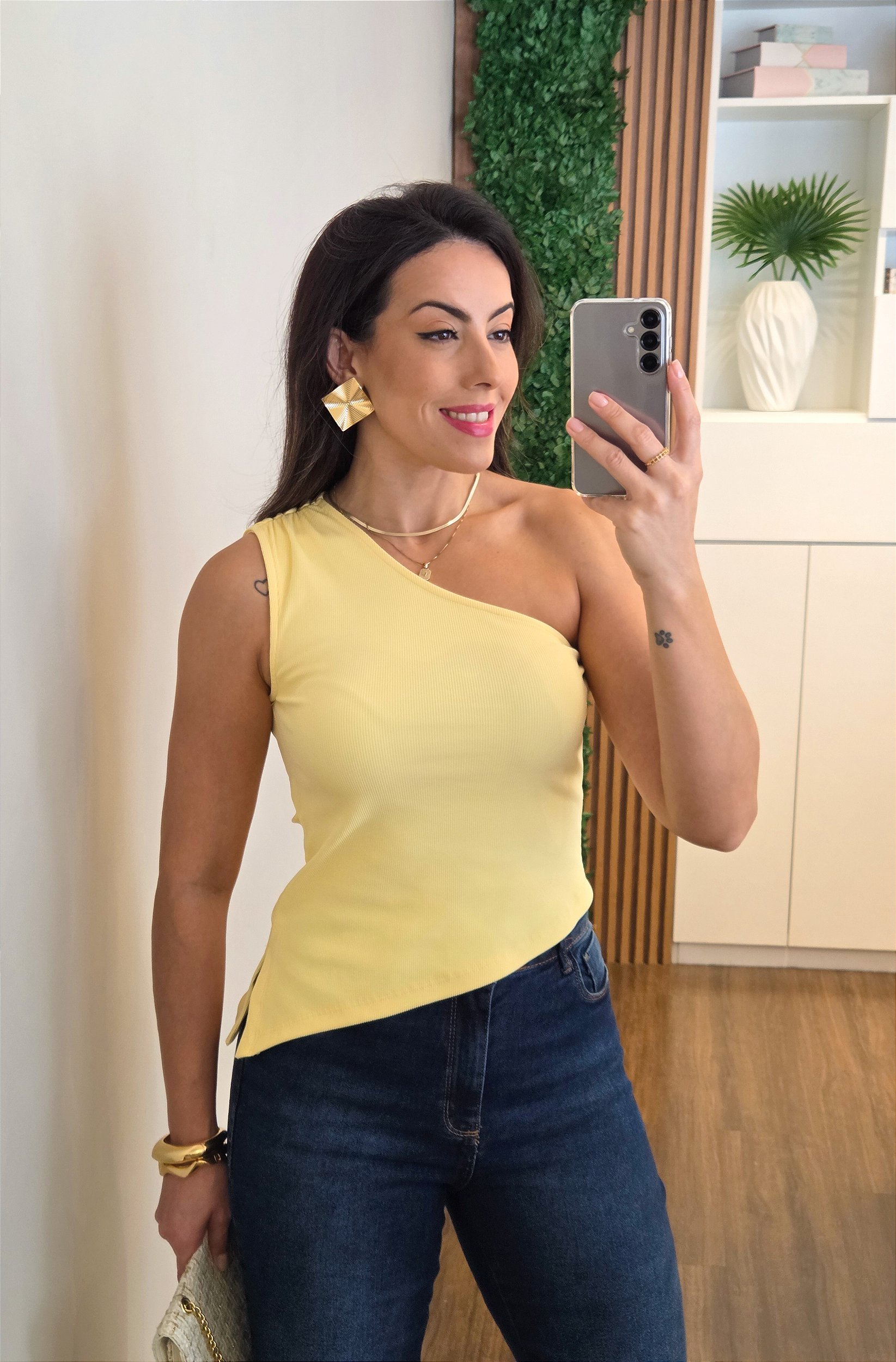 Regata confeccionada em malha canelada de poliamida, tecido encorpado, com elasticidade e toque gelado, modelagem nula manga (um ombro só), detalhe de franzido no ombro com elástico e barra assimétrica com bico e fenda.