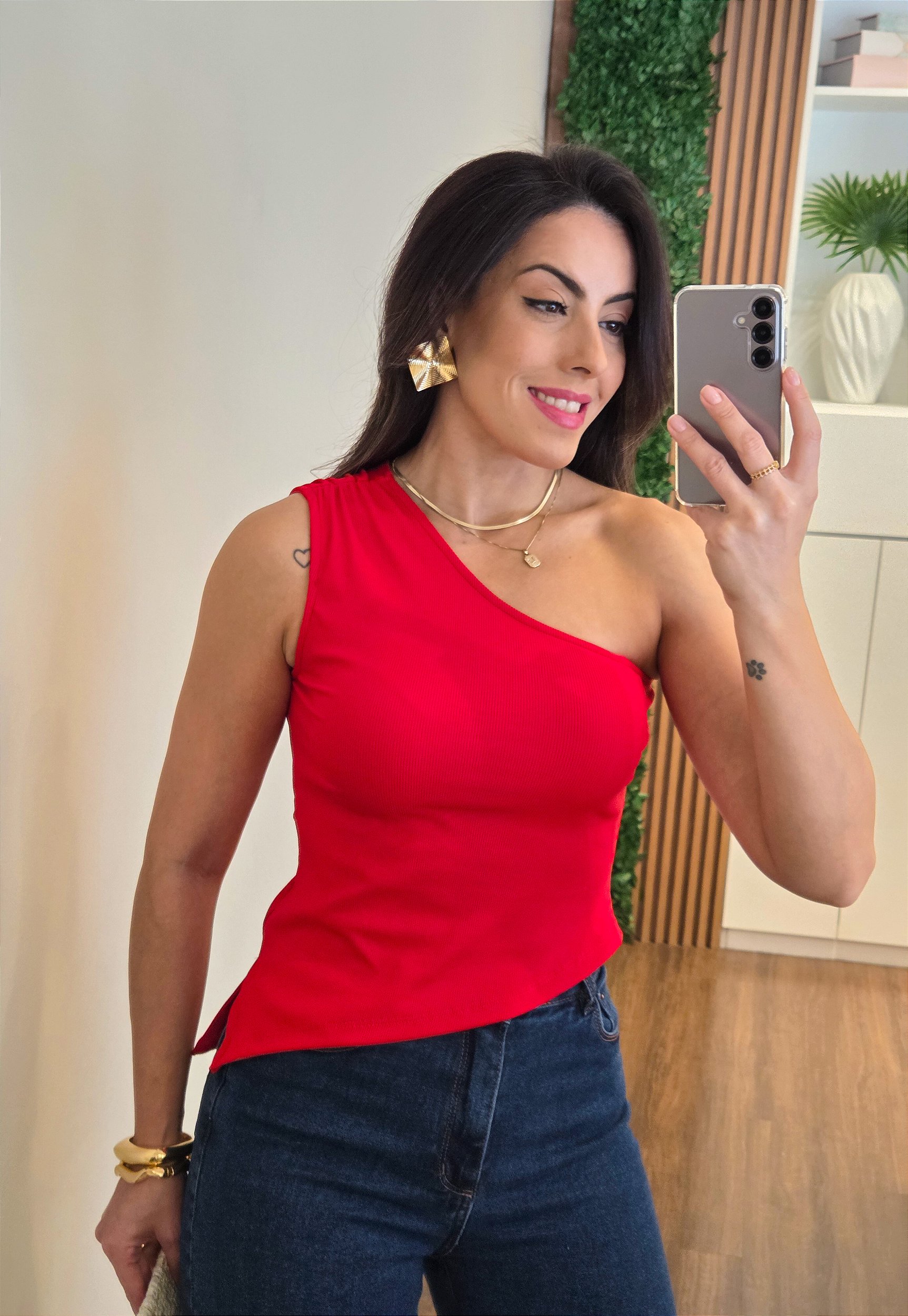 Regata confeccionada em malha canelada de poliamida, tecido encorpado, com elasticidade e toque gelado, modelagem nula manga (um ombro só), detalhe de franzido no ombro com elástico e barra assimétrica com bico e fenda.