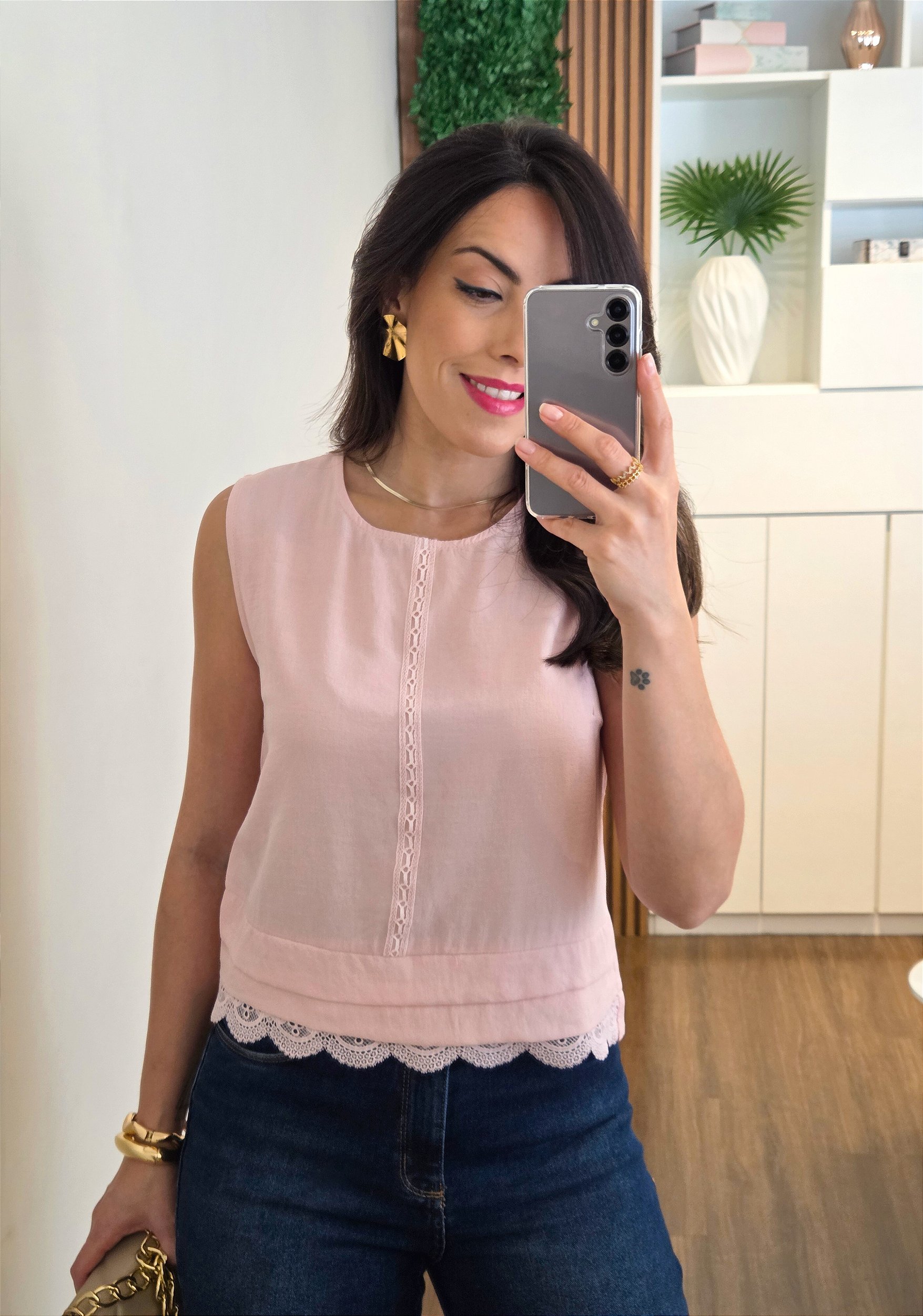 Regata confeccionada em viscose com poliéster, modelagem sem mangas, com decote redondo e fechamento em botão gola costas, frente com detalhe de renda guipir no entremeio, barra com dobradura e acabamento em renda guipir vazada.