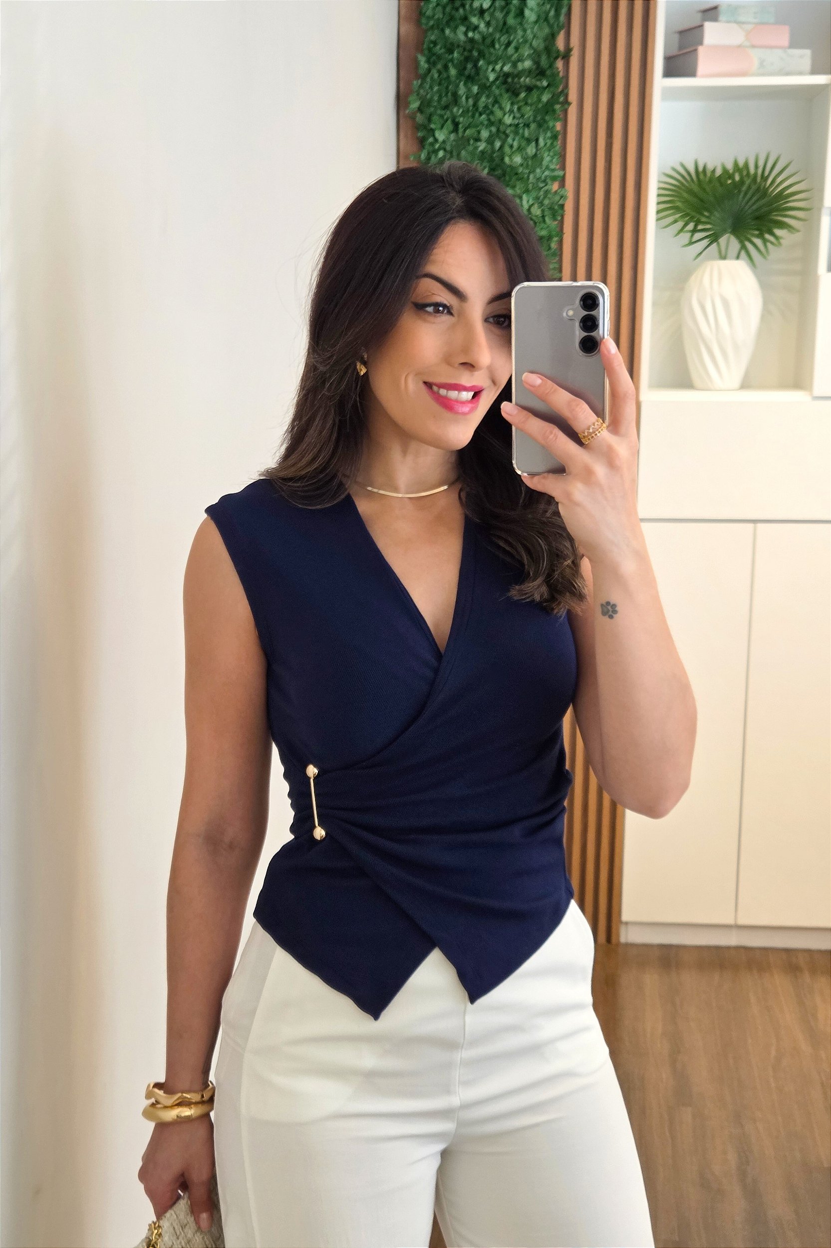 Regata confeccionada em ribana, tecido encorpado, canelado e com elasticidade, modelagem bem acinturada e ajustada ao corpo, sem mangas, costas fechadas, pregas na cintura, transpasse frontal com decote V e barra em V,  e detalhe de fivela dourada lateral.