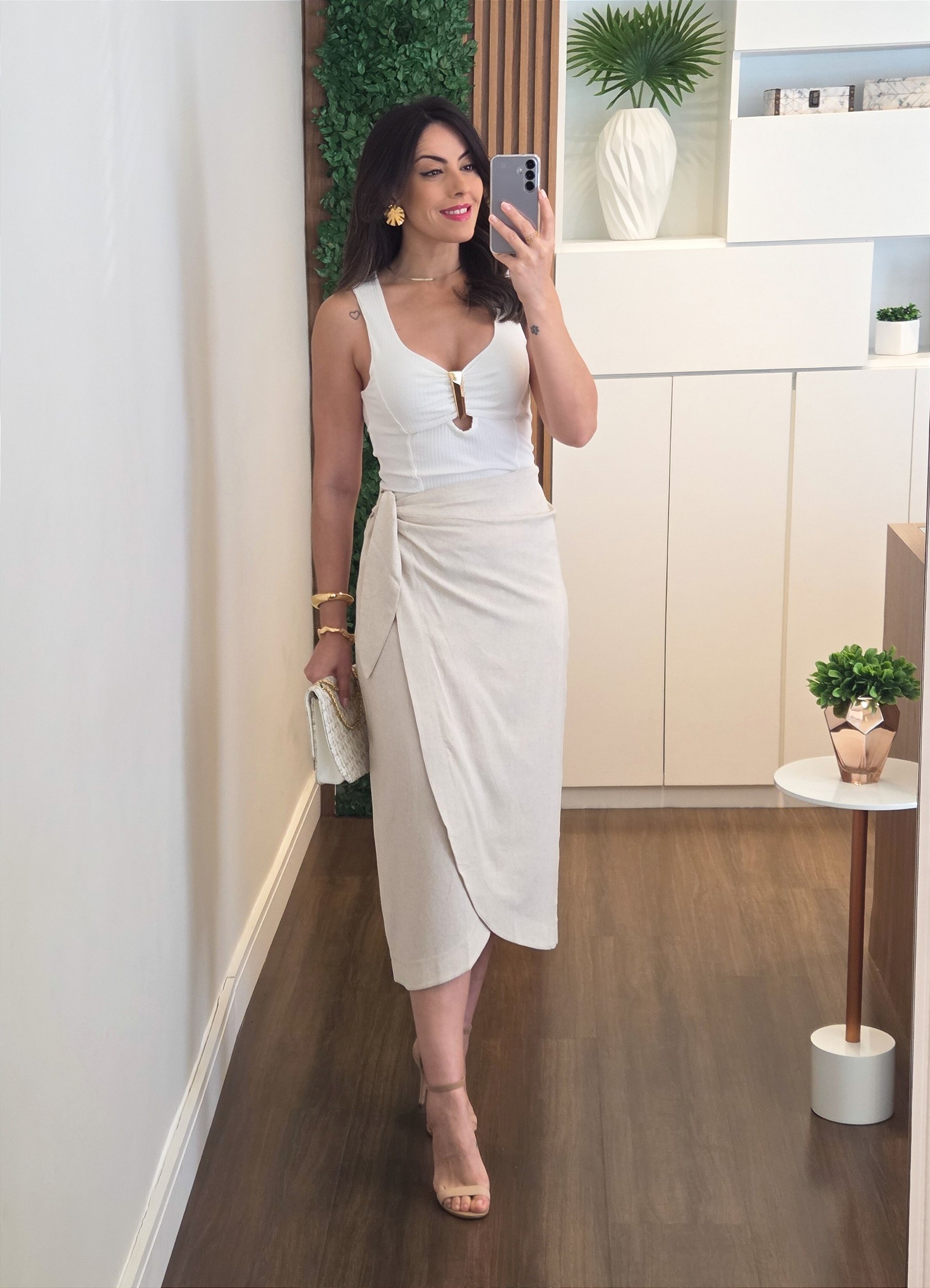 Saia midi confeccionada em viscose e linho, com modelagem envelope, cintura alta com elástico nas costas, frente transpassada com fechamento interno em botão (possui dois botões para regulagem de tamanho), detalhe de pregas e amarração lateral ajustável.