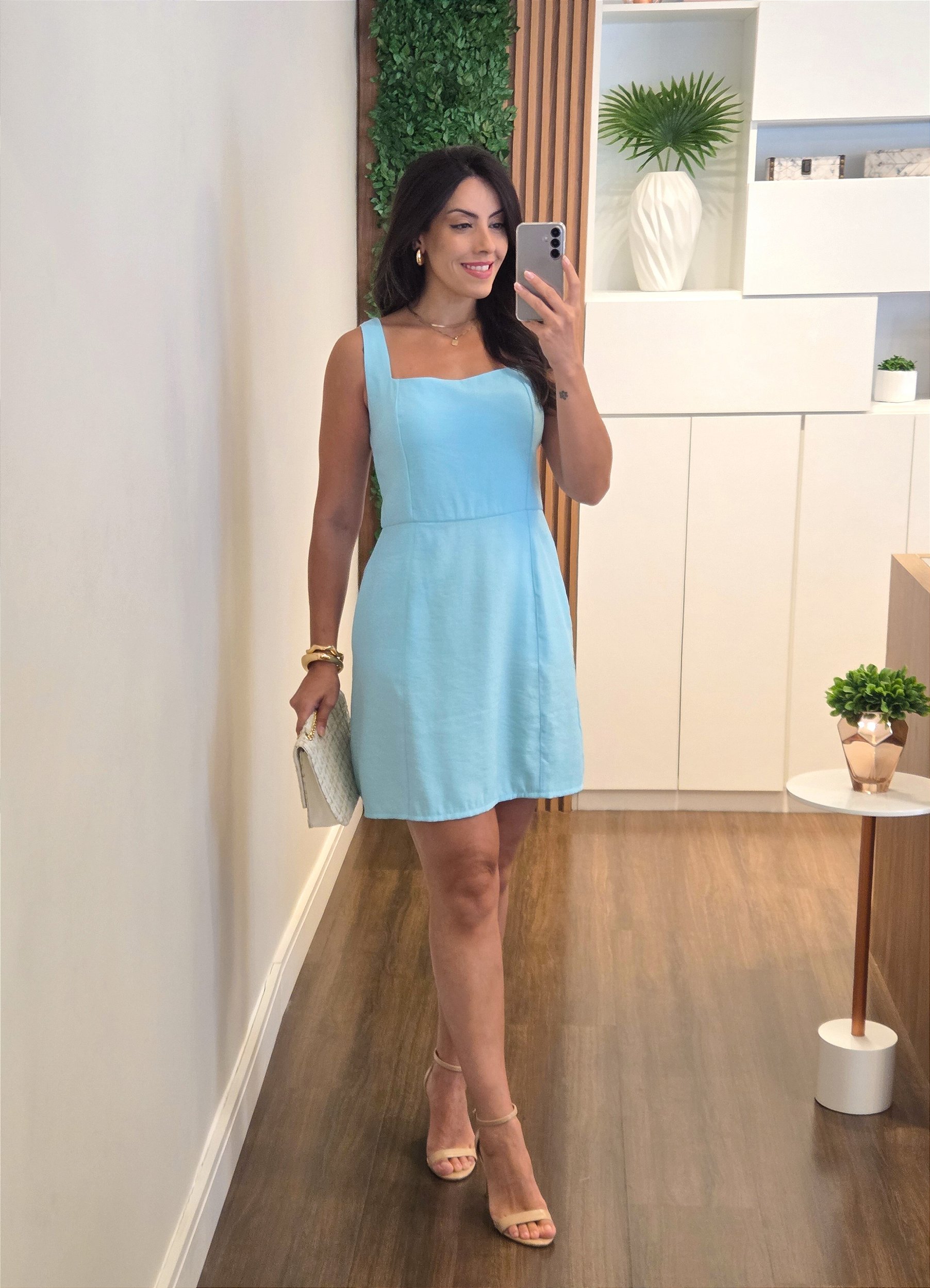 Vestido curto, confeccionado em viscose sarjada, com tecido duplo no busto, alça larga, decote quadrado, modelagem acinturada, saia evasê, bolso faca frente e costas com detalhe de lastex e amarração.