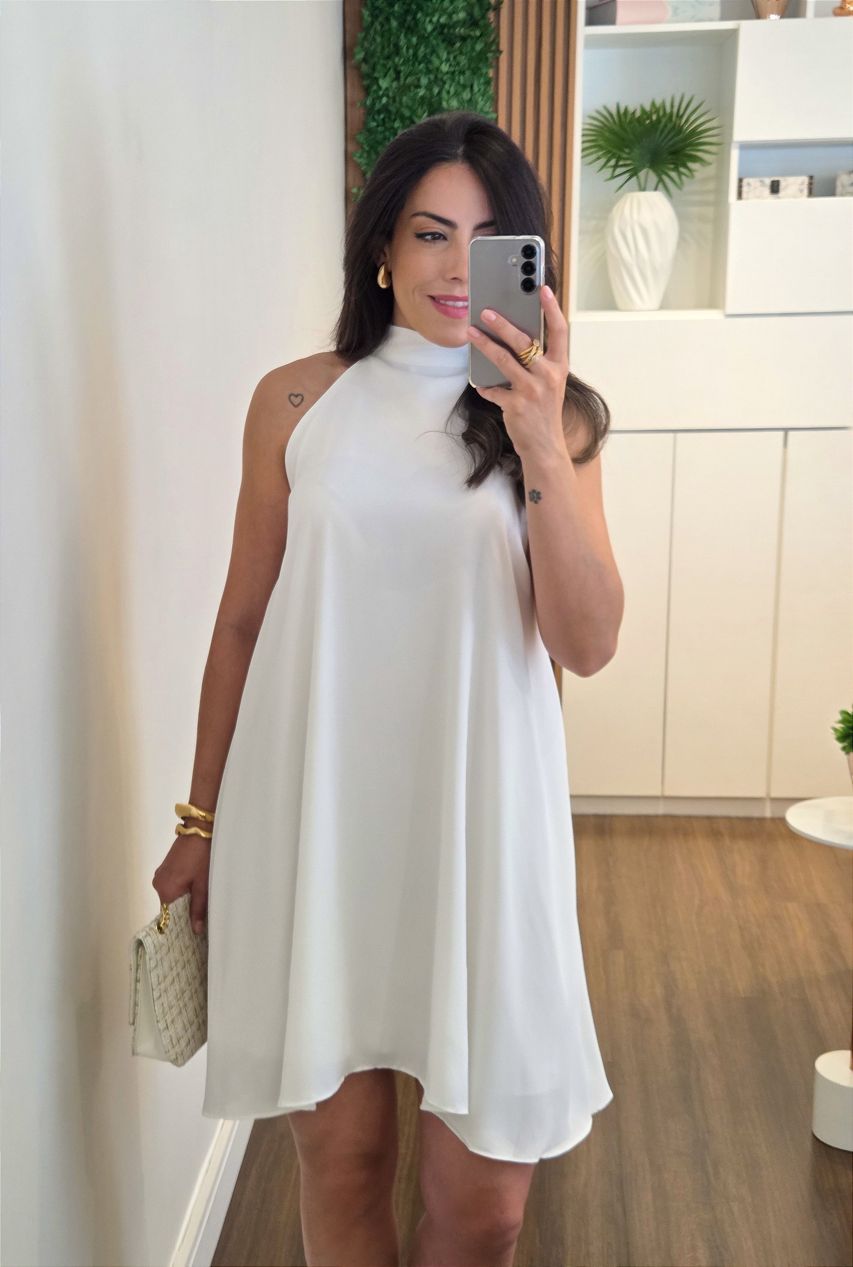 Vestido confeccionado em crepe, tecido leve e fluído, todo forrado, com corte evasê, modelagem ampla e soltinha no corpo, decote cava americana com gola alta e amarração ajustável nas costas.