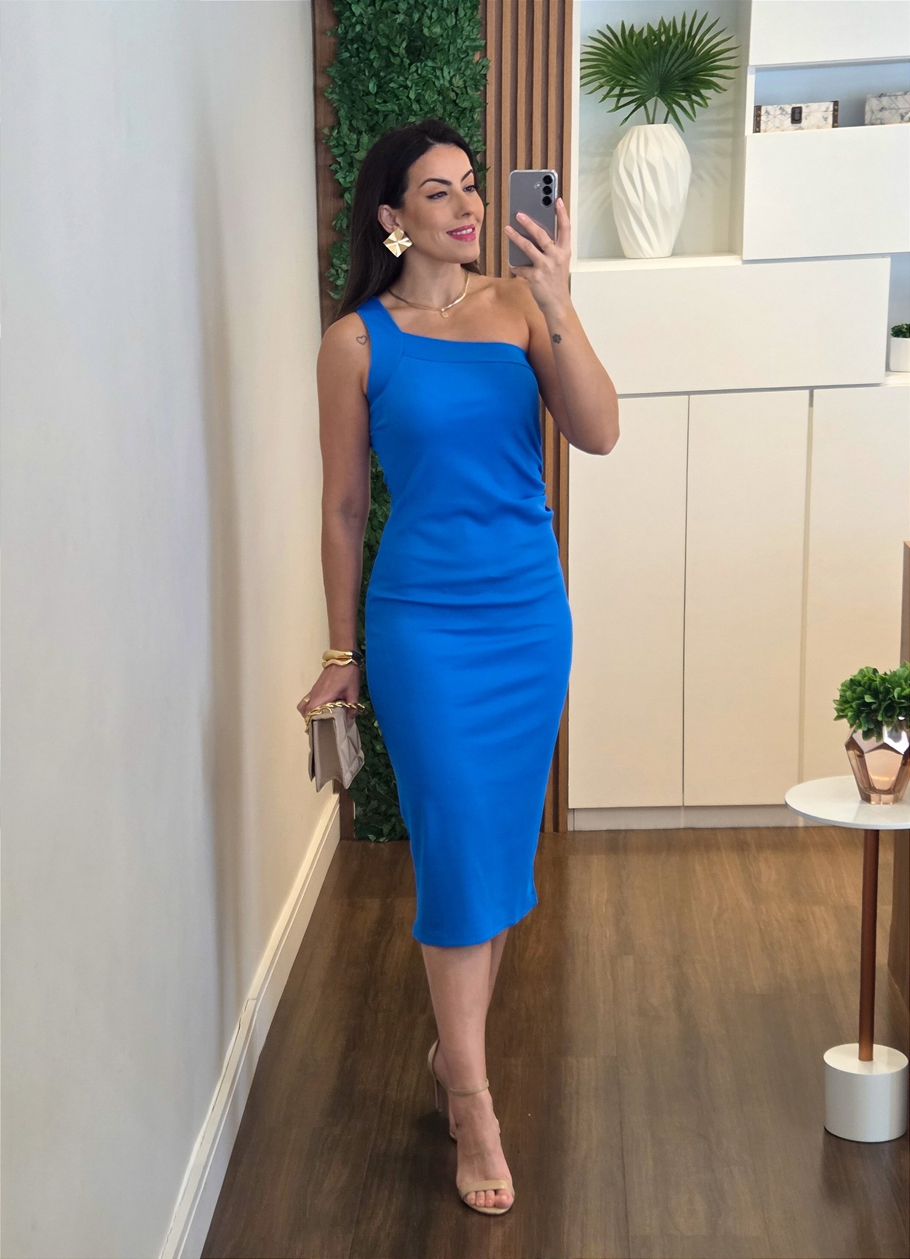 Vestido confeccionado em ribana canelada , tecido encorpado composto de poliamida e elastano, com toque gelado e boa elasticidade, modelagem ajustada ao corpo, com corte de um ombro só e comprimento midi.
